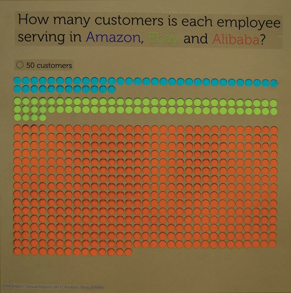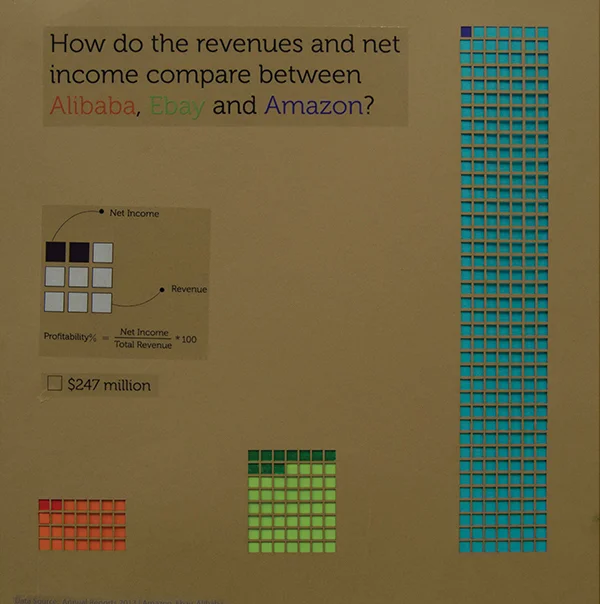 Comparing Amazon, Alibaba and Ebay using data from their annual report. The objective of the visualization was to evoke curiosity, catch attention and make the data easy to understand. For this, we used the visual language of paper cutting to create a contrast between the type of organizations chosen and the medium through which it was expressed.